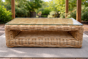 Stolek 140x70x50cm s pevnostním sklem ze syntetického ratanu.
