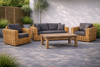 Přírodní ratan je odolný vůči běžným povětrnostním podmínkám i mrazu. Při dlouhodobém vystavení přímému slunci a dešti dochází k přirozenému šednutí materiálu, což je typická vlastnost přírodního ratanu a nemá vliv na jeho pevnost ani funkčnost. Pro zachování původní barevnosti doporučujeme umístění soupravy alespoň pod pevnou střechu.