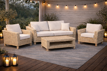 Ratan cubu je ponechán v přírodním stavu, je bezúdržbový a dobře odolává běžným povětrnostním podmínkám i mrazu. Při dlouhodobém vystavení přímému slunci a dešti může docházet k přirozenému šednutí materiálu, což je typická vlastnost přírodního ratanu a nemá vliv na jeho pevnost ani funkčnost. Pro zachování původní barevnosti a dlouhodobého vzhledu doporučujeme umístění sestavy alespoň pod pevnou střechu. Zimní uložení venku je možné, pokud nábytek není vystaven nepříznivému počasí.
